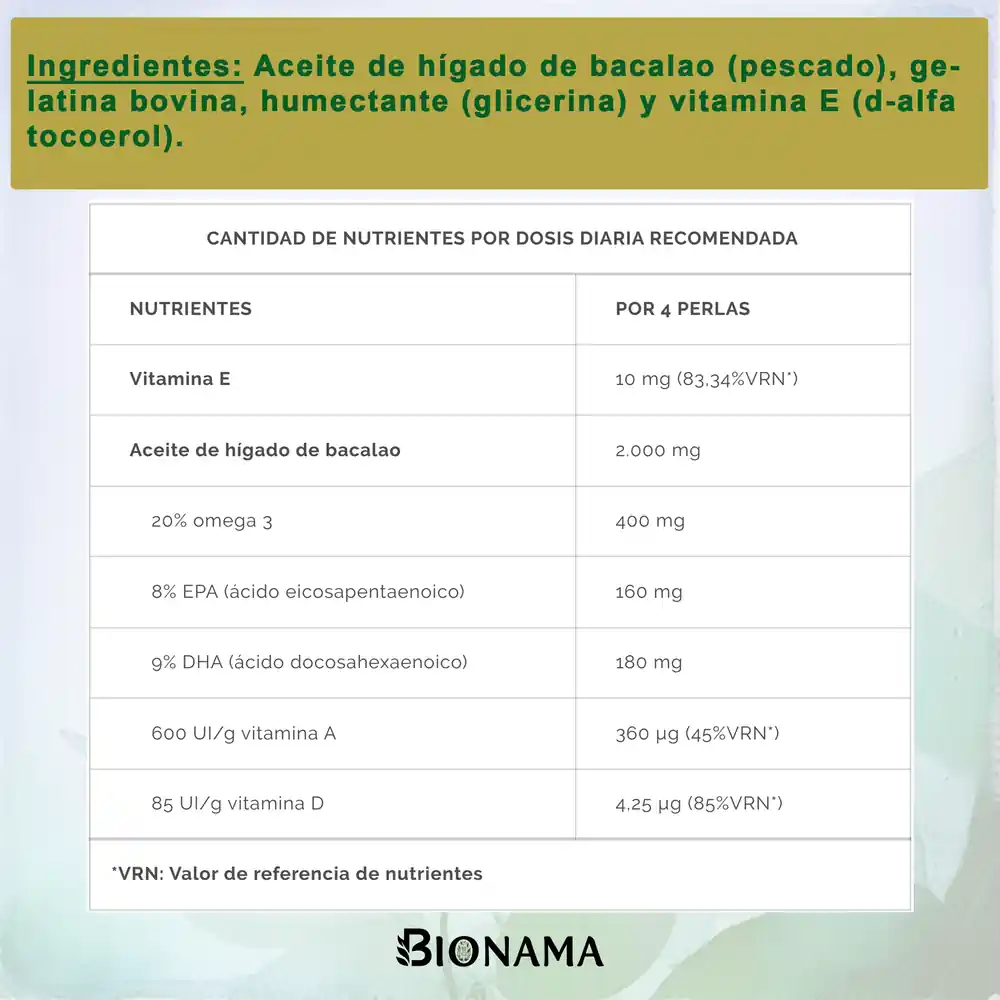 Descubre las perlas de aceite de hígado de bacalao de Bionama, un aliado natural cargado de nutrientes esenciales como vitaminas A y D y ácidos grasos Omega-3. Cada perla es una fuente de vitalidad que cuida tu cuerpo desde el interior.